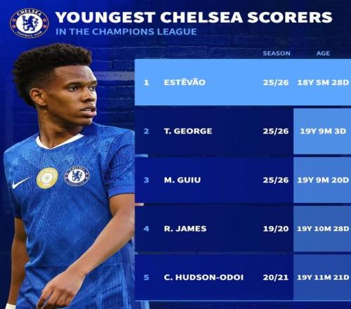 北京时间10月23日,切尔西在欧冠联赛阶段第3轮的比赛中主场5-1大胜10人作战的阿贾克斯,其中18岁的埃斯特旺、19岁的泰里克-乔治以及19岁的吉乌均有进球入账,赛后在德转统计出的切尔西队史欧冠最年轻进球榜上,这三名球员位列前三。