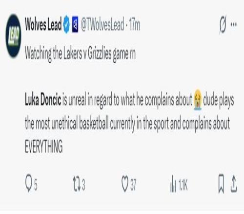 但森林狼的媒体却觉得詹黑媒体在胡扯,他写道:我正在看湖人VS灰熊的比赛,东契奇对着裁判各种抱怨自己被犯规,这位运动员打球的手段实在是太不道德了,他对所有事都喋喋不休。